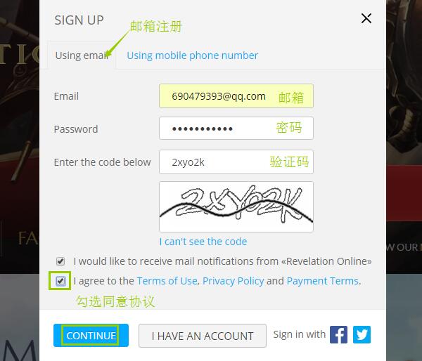 2、选择邮箱注册或是手机号注册,这里小编选择邮箱注册,按提示填写邮箱、密码、验证码,勾选同意协议,点击“CONTINUE”,进入下一步。