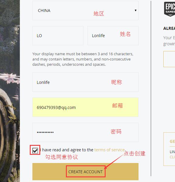2、按照提示选择地区,填写姓名、昵称、邮箱、密码等信息,然后勾选同意协议,点击“CREATE ACCOUNT”,创建账号。