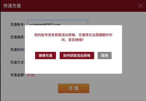4、如果已符合活动规则,则在提交充值订单时,不会出现下方提示